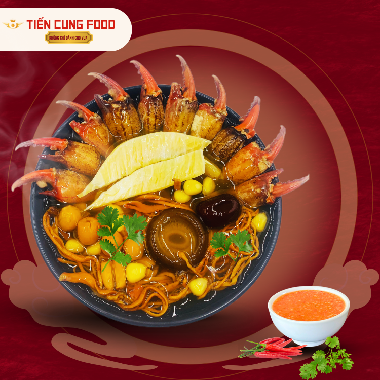 Món ăn bao gồm 10 Càng cua thịt + 2 Vi cá thịt thượng hạng kết hợp với nước súp hầm xương 72h cùng đông trùng hạ thảo, táo đỏ, bắp ngọt, kỷ tử, hạt sen,…